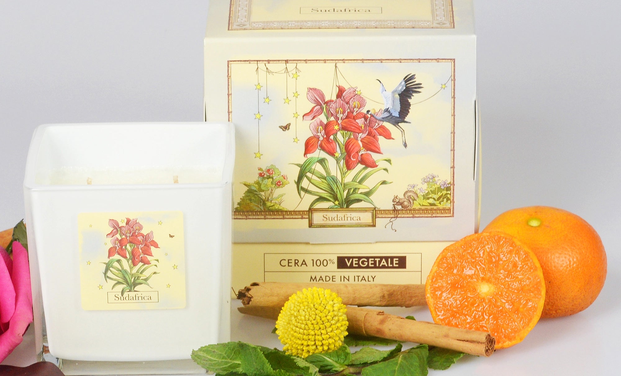 This candle gives us a bold and vibrant fragrance. Notes of citrus and leather embellished with Ambergris and Patchouli intertwine, taking us to the heart of the savannah, surrounded by the magnificence of South African fauna and flora, with lions and giraffes walking majestic.