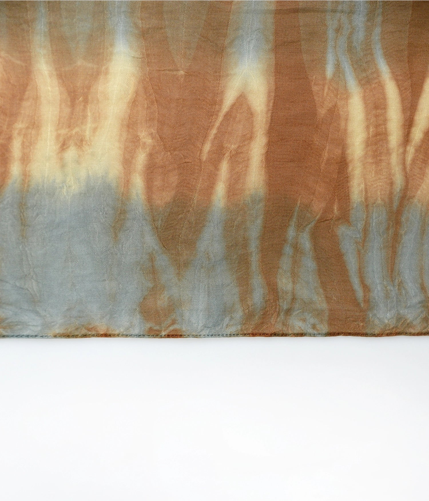 Un gioco di striature cromatiche calde e autunnali, impreziosite da pennellate ottanio. Questo foulard versatile esprime calore e raffinatezza, ideale per ogni stagione.